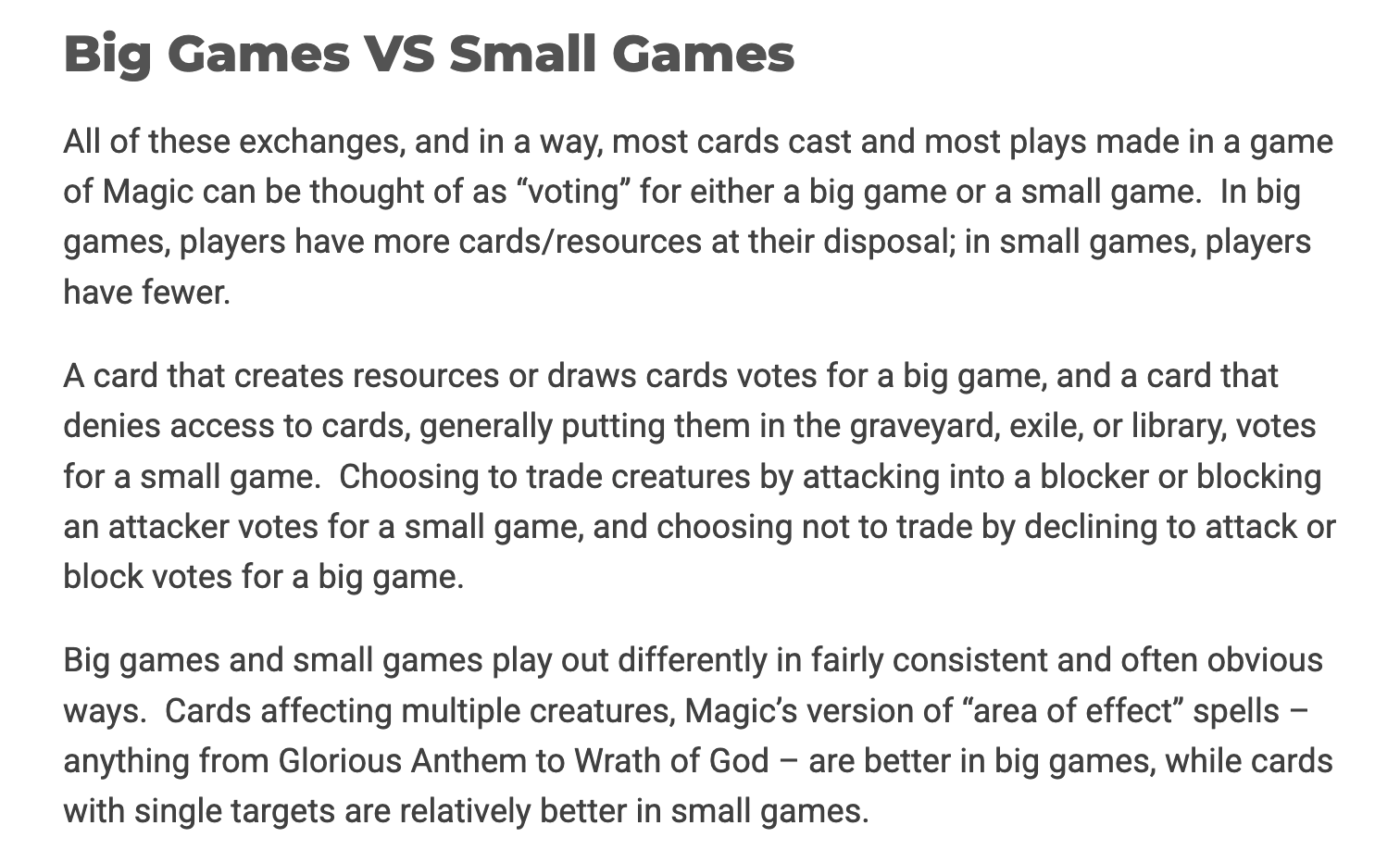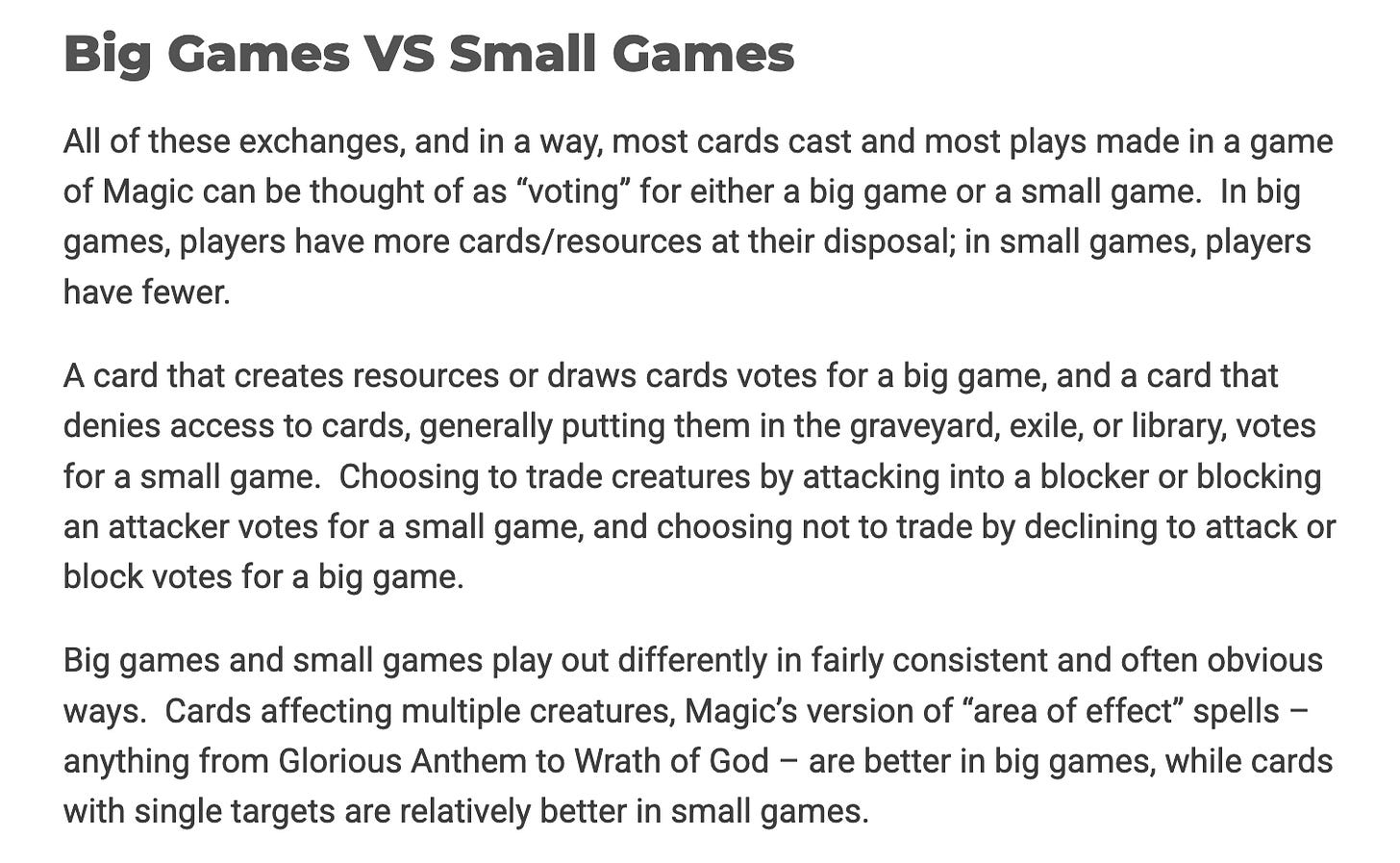 Big games and small games play out differently in fairly consistent and often obvious ways. Magic’s version of “area of effect” spells – anything from Glorious Anthem to Wrath of God – are better in big games, while cards with single targets are much better in small games.”